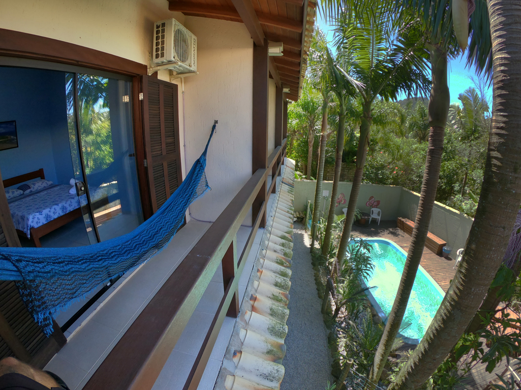 Suíte no andar superiorda Pousada El Pátio em frente a piscina, a pousada dispõe de internet WIFI, piscina, ducha e cozinha comunitária completa. Localizada no centrinho, bem no coração da Ferrugem a apenas 1 quadra da praia, para dormir ouvindo o barulho do mar!